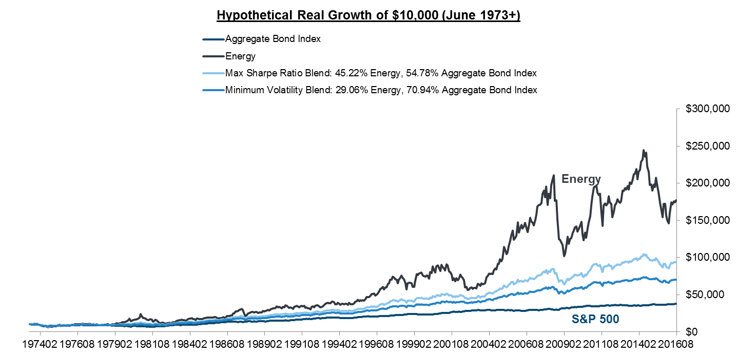 Notes: Past performance is not a guarantee of future returns. Top holdings information from ETF.com. Sector average expense ration from ETFDB.com. Foreign Stock index uses MSCI EAFE Index through 12/2015 and Deutsche CROCI World Index for 2016+. Risk-free rate assumed to be 0% for Sharpe Ratio calculations. Minimum volatility and Maximum Sharpe Ratio portfolios based on proprietary analysis of past returns and volatility. Index data defined as follows: Short Term Bonds: Barclays 1-3 Year Government Index (1/1976+); Aggregate Bond Index: Putnam Income Fund A Shares (12/1954-12/1975), Barclays Intermediate Aggregate Bond Index (1/1976+); S&P 500: Ken French US sector data (7/1926-12/1969), S&P 500 Composite Total Return (1/1970+); All World Stock Index: MSCI All World Index (1/1988+); MSCI EAFE Developed Countries: MSCI EAFE Developed World Index (1/1970+); Emerging Markets: Average of MSCI EM Europe and Latin America indices (1/1988-12/1993), Lipper Emerging Markets Funds IX (1/1994-12/1998), MSCI Emerging Markets Index (1/1999+); Energy: Ken French Oil sector data (7/1926-1/1991); Dow Jones US Oil & Gas Total Return Index (2/1992-12/1998); SPDR Energy Select Sector (1/1999+)Real returns calculated based on CPI index.