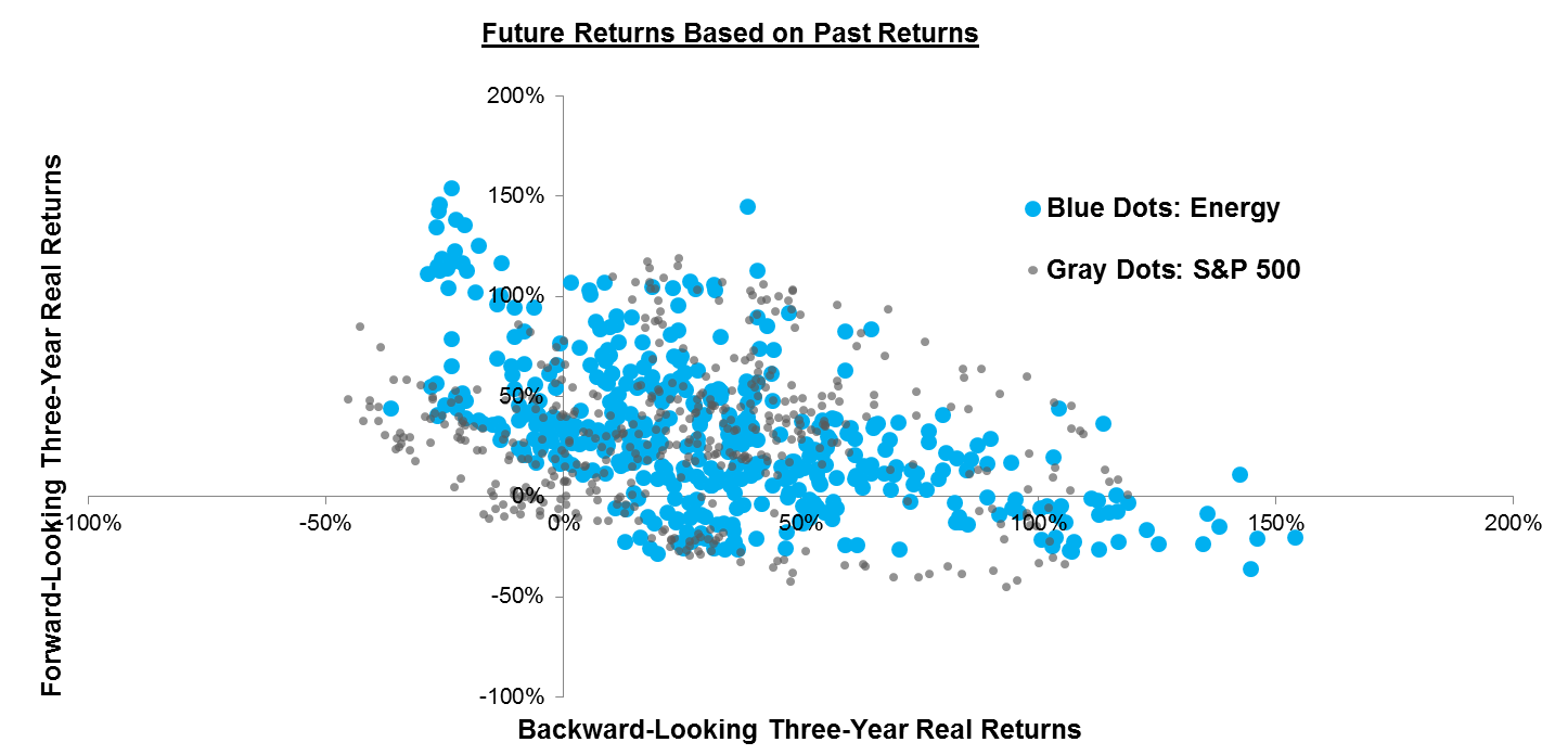 This mean reversion means low past returns in Energy are generally followed by strong future returns, and vice versa. This is no guarantee, but it means that buying after terrible performance–though painful–is wisest, as is trimming after a banner year. But we all know this: it’s simply buying low and selling high. Energy is a textbook case of an asset class where investors are best-served by setting a target allocation to hold in all environments and simply buying or selling to rebalance back to that target.