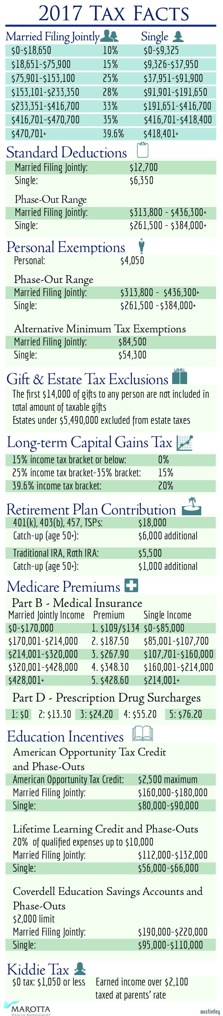 If you’re doing some tax planning this year, here is a quick guide to the brackets along with other useful information about what else to expect in 2017. Most numbers have not changed much from 2016, but there are a few adjustments.