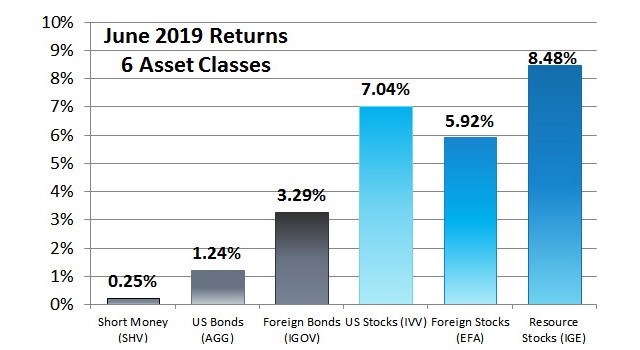 Here are the returns for the month of June 2019 for the six asset classes as represented by six iShares exchange traded funds (ETFs):
