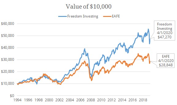 As you can see, the $10,000 in the Freedom Investing portfolio grew to $47,270, which is an annual rate of return of 6.323%. Meanwhile, the EAFE Index grew only to $28,848, which is an annual rate of return of 4.271%. That means that over these measured 25 years, Freedom Investing had a 2.053% annual advantage over investing in the EAFE Index alone.