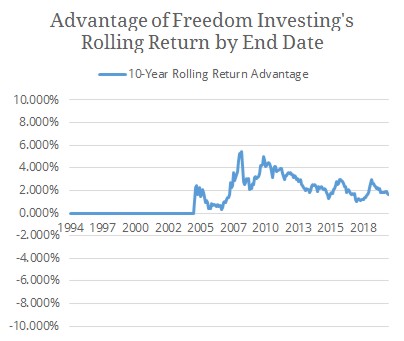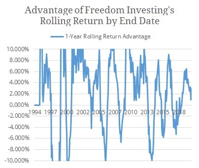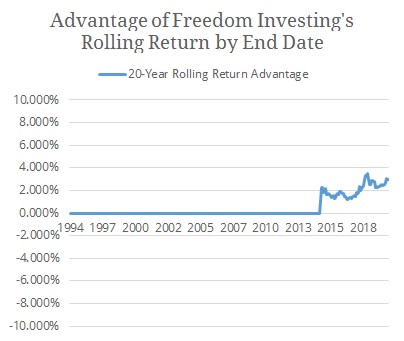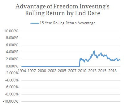 When testing an investment strategy or fund using historical data the start and end date matter significantly. Although a 25-year advantage is a wonderful finding in support of Freedom Investing, there is no way of knowing it if tells the whole story. Furthermore, 25-years of data is actually a relatively small amount of available data in the world of investing. Even 30 years of returns may be insufficient to be predictive of the next 30 years.