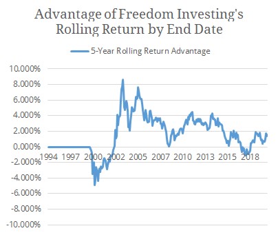In these graphs I have subtracted the EAFE Index rolling return for various time periods from the Freedom Investing rolling return over the same time period to show Freedom Investing’s advantage over the EAFE Index as a positive number and its disadvantage as a negative one.