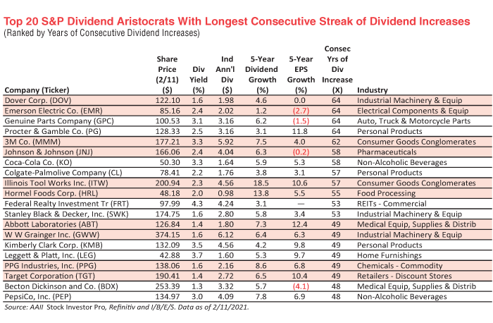 Five years ago, a March 2021 AAII article entitled “Dividend Aristocrats With Longest Streak of Dividend Increases” highlighted a group of such companies, and I saved the article anticipating that these 20 stocks would not out perform the value stock index they came from.