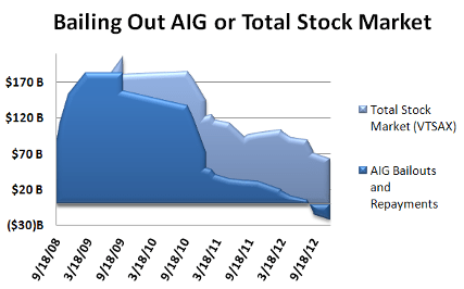 To further explore this thought experiment, imagine that if instead of bailing out AIG, this same money had been invested across all American businesses during the financial crisis. For comparison, we can invest this same capital in the Vanguard Total Stock Market Index (VTSAX). This fund is designed to represent the returns of the entire U.S. equity market including small-, mid- and large-cap stocks.