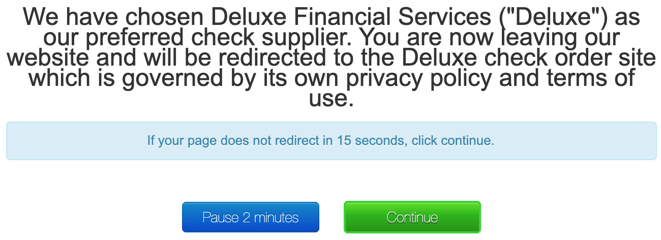 Clicking the link opens a new tab or window that is the URL “orderpoint.deluxe.com/personal-checks/home.htm.” On that page, Deluxe will first provide a message to inform you that you are being redirected to the Deluxe check order site as shown below: