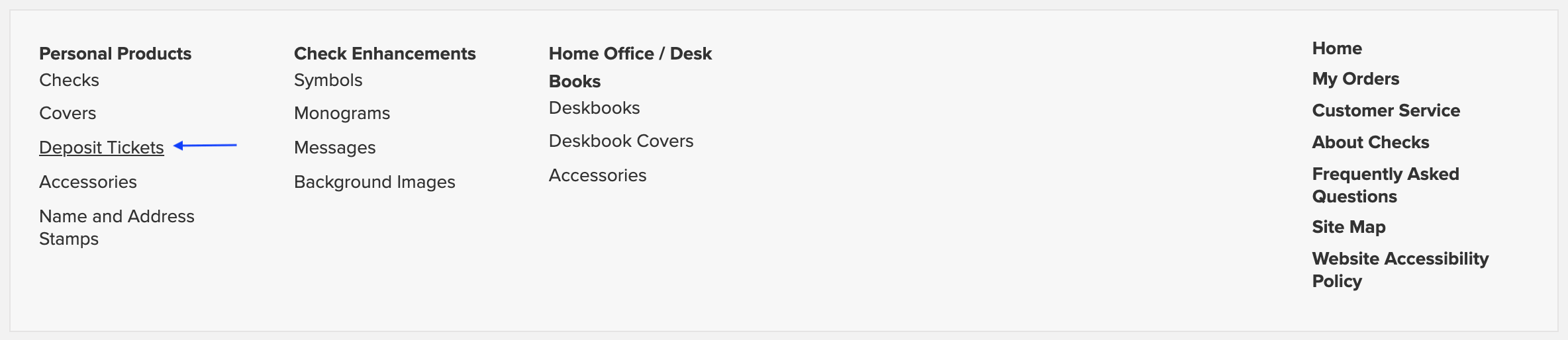 To order deposit slips, click “Deposit Tickets” under the “Personal Products” heading towards the bottom of the page.