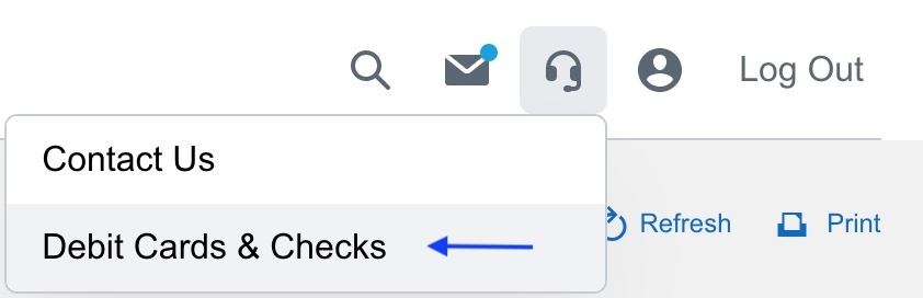 After logging in to Schwab Alliance at https://www.schwab.com, click on the headset icon in the top right corner and select “Debit Cards & Checks”.