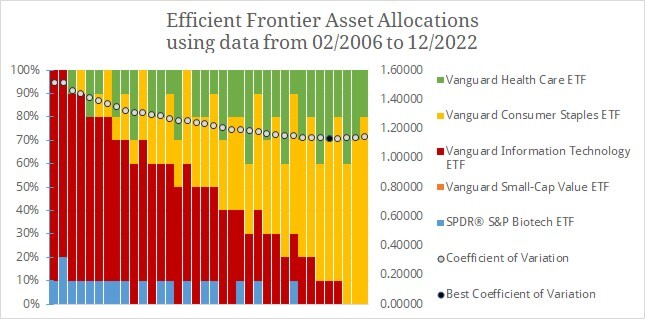 Using the market returns of SPDR® S&P Biotech ETF (XBI), Vanguard Small-Cap Value ETF (VBR), Vanguard Mid-Cap Value ETF (VOE), Vanguard Consumer Staples ETF (VDC), and Vanguard Health Care ETF (VHT) from August 2020 through December 2022, the three lowest risk portfolios on the efficient frontier all included a 10% allocation to XBI.