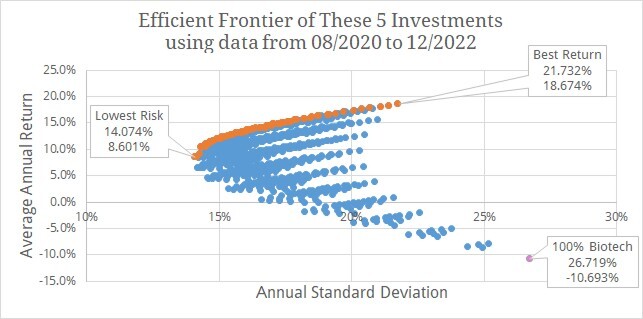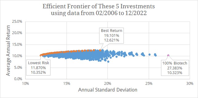 This graph shows a scatter plot of all possible portfolios created by blending these five assets in 10% allocations. The orange dots are the efficient frontier while the blue dots do not afford enough return given their risk to make it on the frontier. The pink dot is 100% Biotechnology. The labels show the portfolio risk followed by its return.
