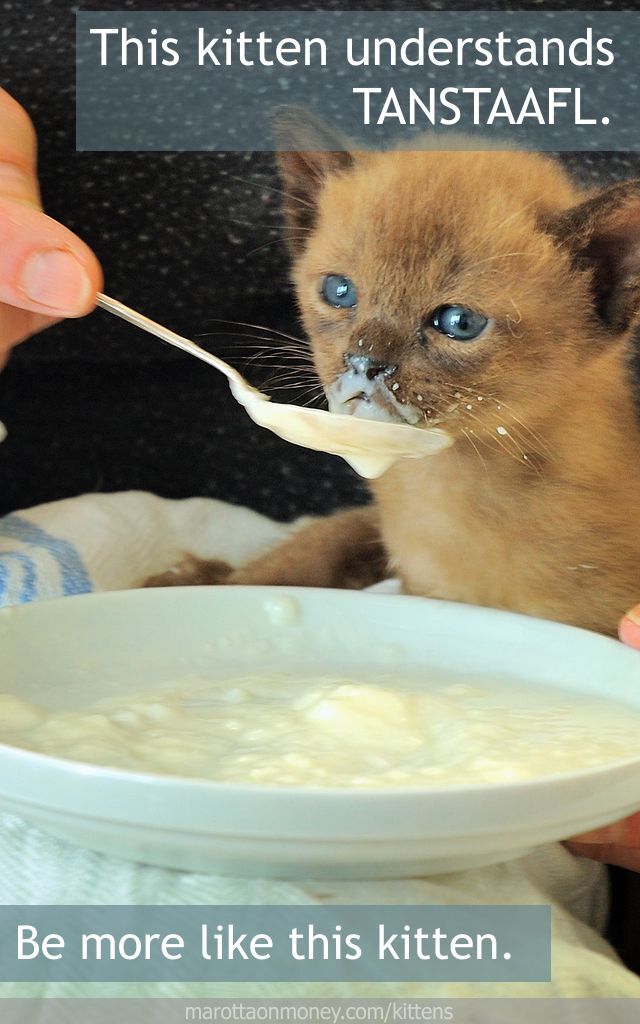 That is why this kitten understands economics in nine works: “There ain’t no such thing as a free lunch.” TANSTAAFL (pronounced “Tan-staffle”). He knows that every lunch fed to him is at the cost of using those resources of time, food, and animals in other ways. With this knowledge, he can correctly view everything from daily choices to political decisions. When someone makes a choice, he asks himself “But what is the cost?”