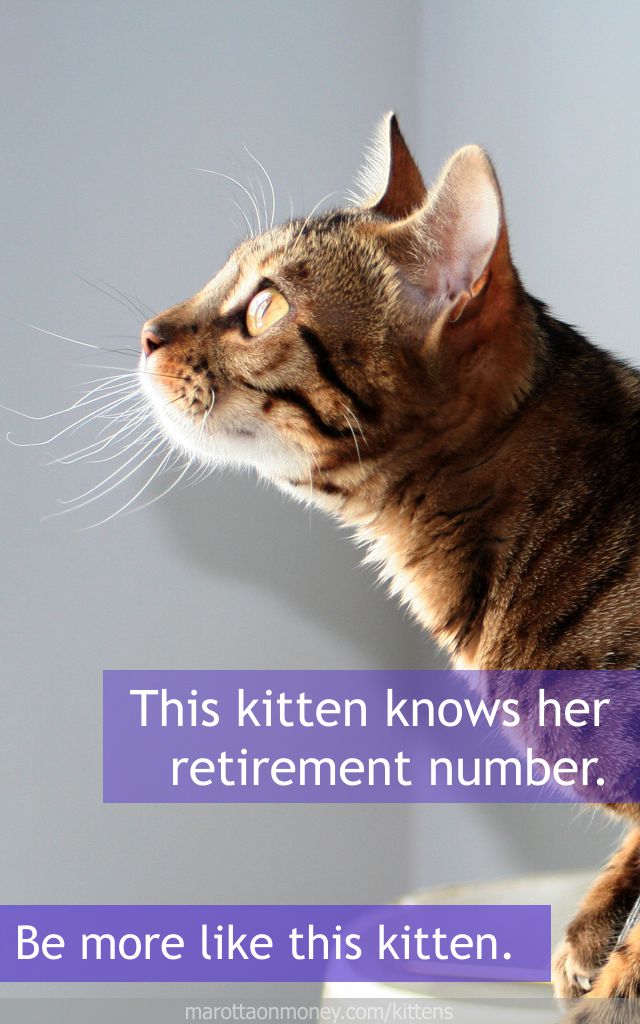 The retirement number simplifies the retirement part of retirement planning. It means that at age 65, you can safely assume that you can withdraw 4.36% of your account and still have your money last your lifetime. The retirement number also is something that can be calculated for even younger retirees. If you’ve done well at saving for retirement, then retiring at age 40 (safe withdrawal of 3.38%) is possible if your standard of living fits in that amount of money. This kitten retired at 50 and hasn’t had to change her standard of living since.