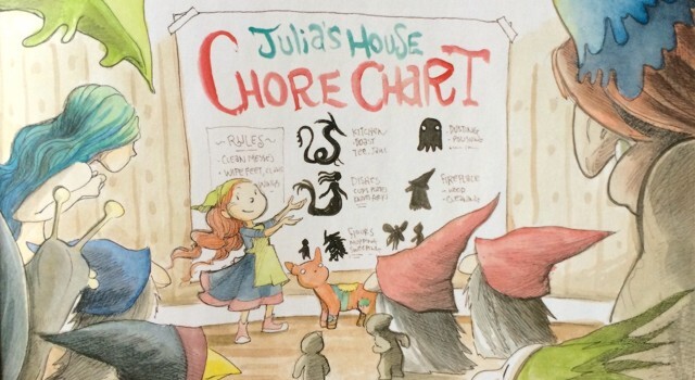 The photo is an excerpt from Julia’s House for Lost Creatures by Ben Hatke. This book has been a great resource in making the concept of household tasks fun. In the book, Julia has a boarding house for fantasy creatures. The house is in chaos until Julia establishes a chore chart so everyone pitches in to make the house great. I highly recommend it!