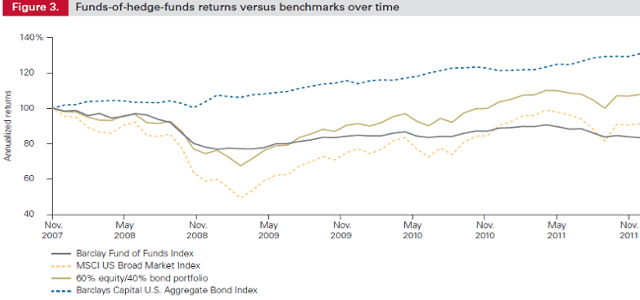 Their analysis found that a broad hedge fund-of-hedge-funds index underperformed a 60% stock and 40% bond portfolio during the 2007 – 2011 market crash and recovery. While the hedge fund index performed 7.7% better during the crash ending in March 2009, this same proxy underperformed the diversified stock and bond portfolio by 15.1% during the following run-up ending in December 2011.
