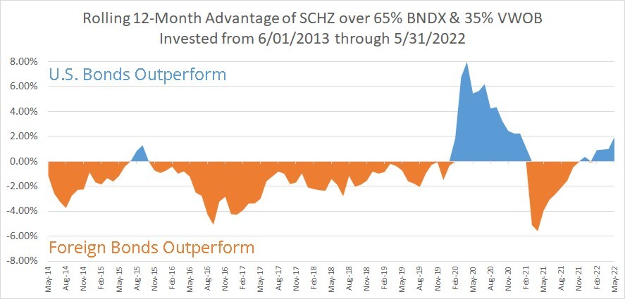 Past performance is simultaneously all we have to predict the future and has little to do with what happens in the future. However, knowing that foreign debt and equity markets have large periods of out-performance may help you overcome your home bias and add some foreign to your allocations.