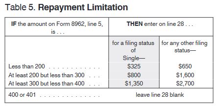 The amount on line 5 is your percentage of the poverty line. If you are less than 400% of the poverty line, then the amount you are required to repay is limited by the amount in the table. If you are over 400% of the poverty line, then you must repay any dollar amount you estimate wrong.