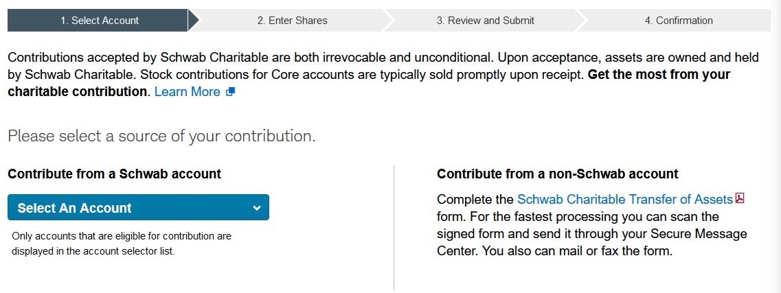 Once your Donor Advised Fund has been opened, Schwab Charitable has a very straightforward process for donating appreciated stock to charity.