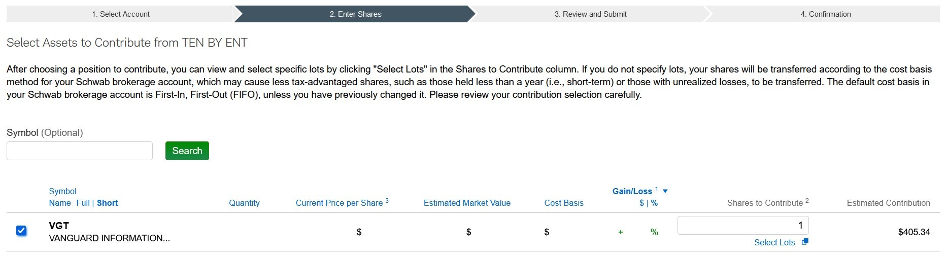 In step two, pick which shares you’d like to donate. The page that loads has a list of all the holdings in your selected account.