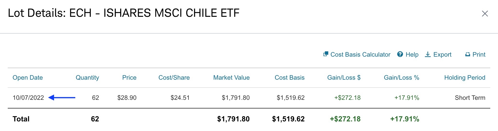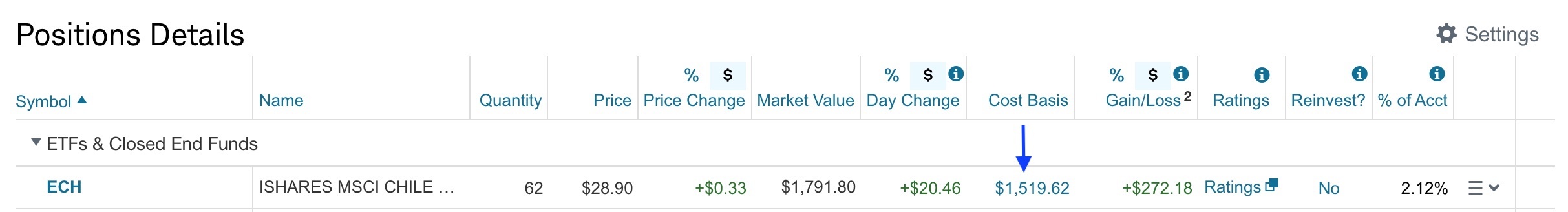 Once you have selected the relevant account, click on the dollar amount shown in blue under the “Cost Basis” column for the relevant security in the “Positions Details” table. Here is an example: