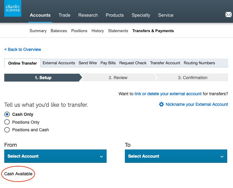There are several moments when it may become important for you to know how much cash (not investments) is in your accounts. For example, the cash balance is relevant if you are transferring funds between your accounts or between your Schwab accounts and outside bank accounts. These types of transfers are commonly used to fund your Roth IRA.