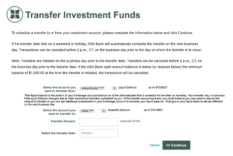Within your HSA Bank account, you can opt to have a separate but related investment account. The investment account is a self-directed investment account at a different financial institution. Contributions to and withdrawals from the self-directed brokerage account must be made via transfers to/from HSA Bank.