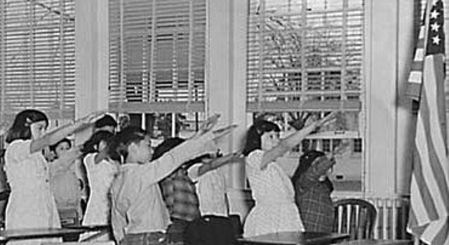 Mindlessly chanting obedience to the state collective was enforced in schools in the United States with corporal punishment. In 1940, the U.S. Supreme Court held that a public school could force students who were Jehovah’s Witnesses to salute the flag and say the pledge despite their religious objections in the case of Minersville School District v. Gobitis in an 8-1 decision. The court concluded that “national unity is the basis of national security” and the ceremony was important “to promote in the minds of children who attend the common schools an attachment to the institutions of their country.”
