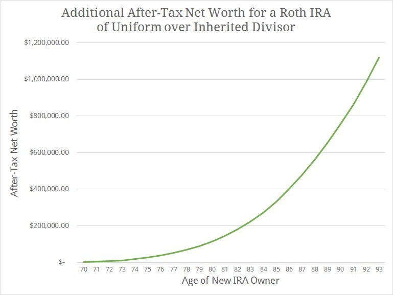 For this widow, a Spousal Rollover is worth over $1.1 million of after-tax value when the account in question is a Roth IRA, even though the distributions of the Inherited Divisor are tax-free. The burden of capital gains is just that great.