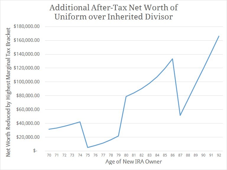 To do this, a decision must be made of what bracket to use, as the two divisors are often in different brackets. I chose to adjust each divisor by the highest marginal bracket in each year. This favors the Inherited Divisor because at age 93 it has no IRA balance to reduce whereas the Uniform Divisor’s IRA balance is reduced by 33%. Here is that graph: