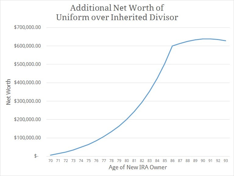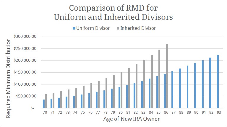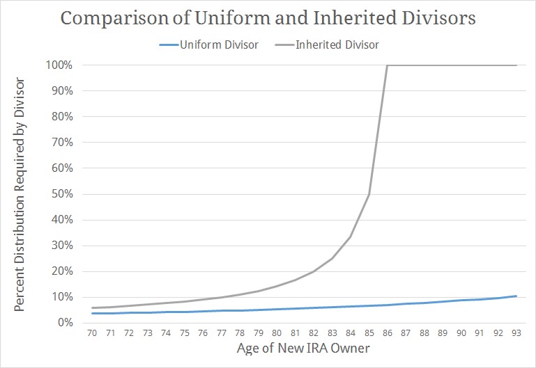 The two divisors work differently. In the first year, the Uniform Divisor would be 27.4 or 3.65% while the Inherited Divisor would be 17 or 5.88%. Then, each year the Inherited Divisor decreases by one, reaching 100% required distribution in 17 years. Meanwhile, the Uniform Divisor decreases more slowly, reaching only 10.42% at age 93 after 23 years of RMDs.