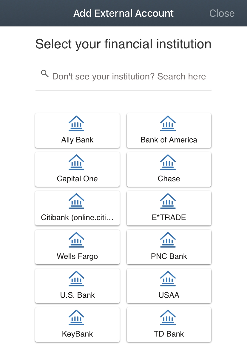 The next page will prompt you to select the financial institution where your external account is held. If you don’t see your financial institution, simply type in the name of your financial institution in the search box provided. The screen should look like this: