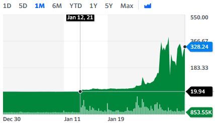 Take for example the recent GameStop (GME) news for instance. Here is the 1 month chart (December 30, 2020 through January 30, 2021) of GME: