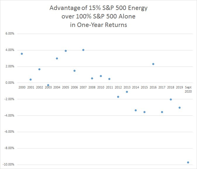 Over the longest time period of data for these sectors on Morningstar, from October 1989 through September 2020, the S&P 500 Energy sector had an annualized return of 6.28%, a standard deviation of 20.60%, and a coefficient of variation of 3.28. Furthermore, Energy appears on the efficient frontier only in a 10% allocation as a part of the lowest risk-return portfolios.
