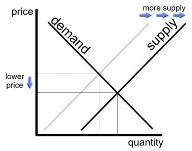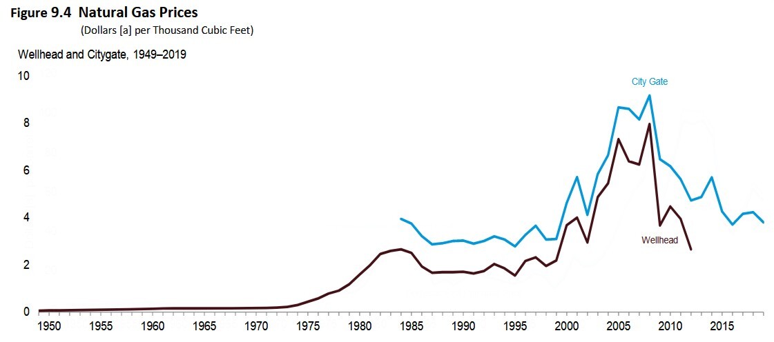 Energy production (supply) has seen a sharp increase within the last ten years while energy consumption (demand) has either remained the same or drifted downward over the same time period. An increase in supply without a change in demand means that the price of the product goes down.