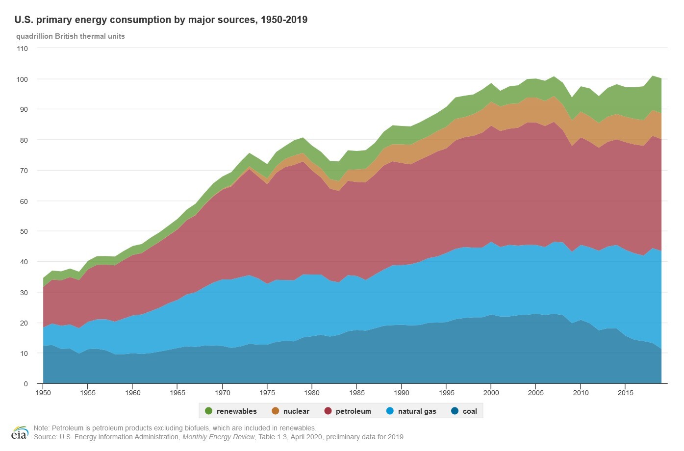 You can see this effect when looking at these two graphs with the same axis units from the U.S. Energy Administration showing the U.S. energy consumption and production from 1950 to 2019.