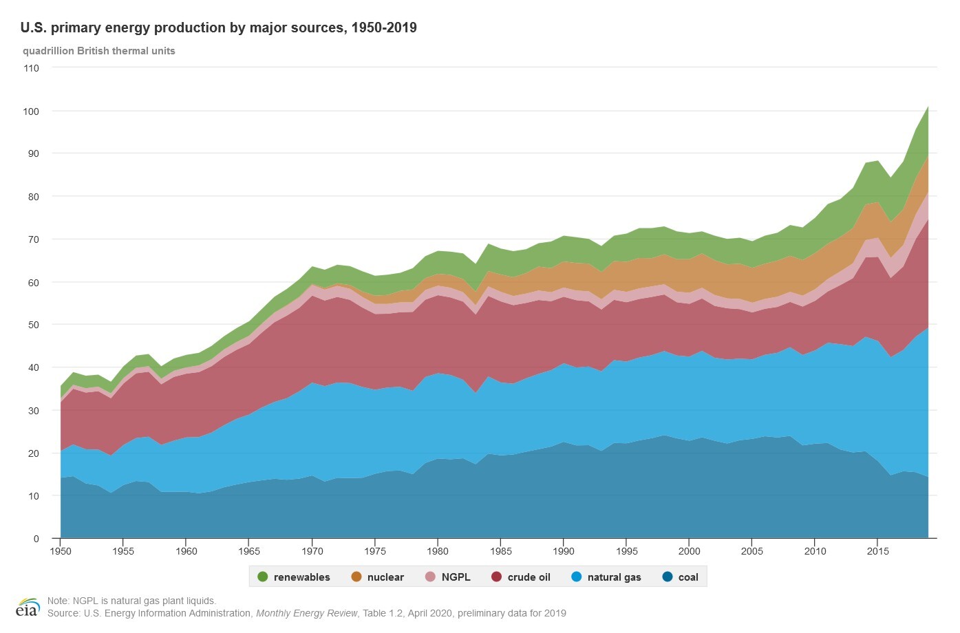 As you can see on this chart, overall energy production has been relatively level for the decades between 1970 and 2009. Then in 2009, production started climbing rapidly.