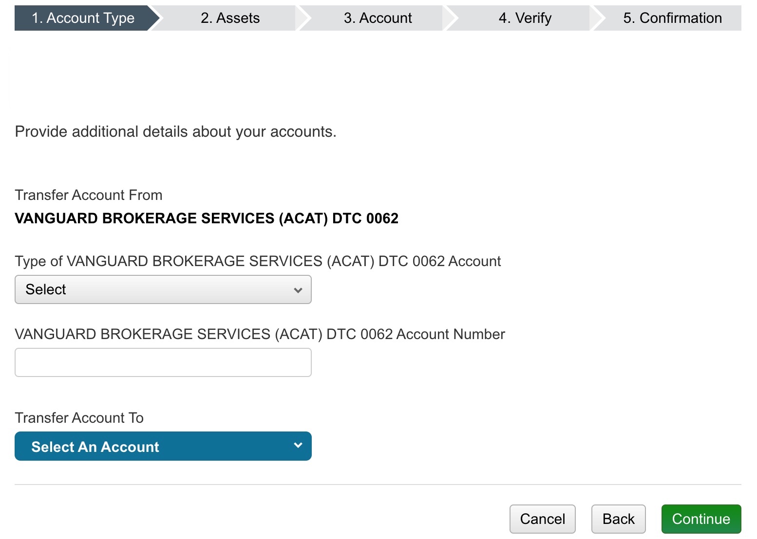 On the next page, you will need to enter your account number and select the account type from the drop down menu. You will also have to select the Schwab account that you would like the funds to transfer into. Here’s an example using Vanguard: