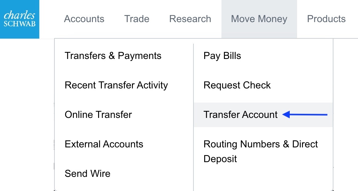 After your receiving Schwab account is open and you have downloaded a recent statement of the account you wish to transfer, login to Schwab Alliance at https://www.schwab.com, select the “Move Money” tab and click “Transfer Account”.