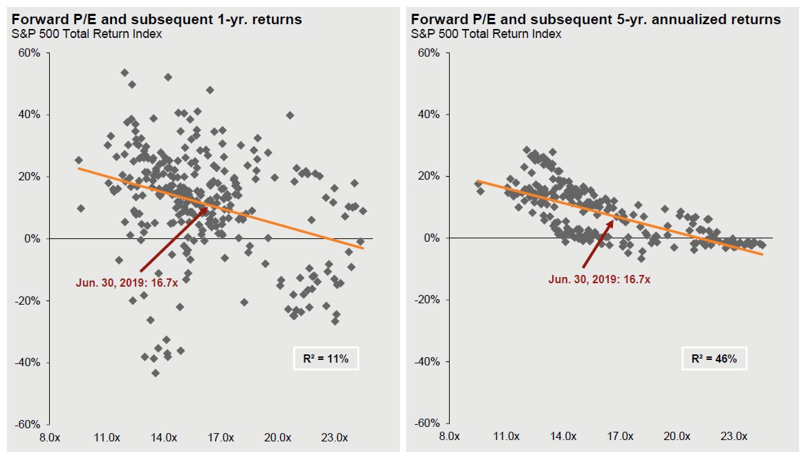J.P. Morgan’s Guide to the Markets has another slide (currently slide 6 of 71) which shows the relationship between the current forward P/E ratio of the S&P 500 and the subsequent 1- and 5-year equity returns. As they explain, “Returns are 12-month and 60-month annualized total returns, measured monthly, beginning June 30, 1994. R² represents the percentage of total variation in total returns that can be explained by forward P/E ratios.”
