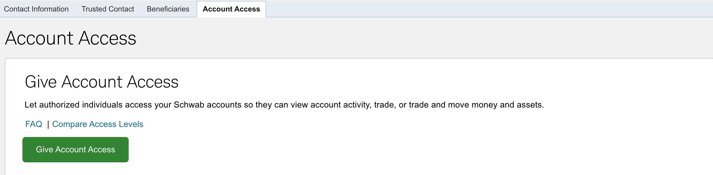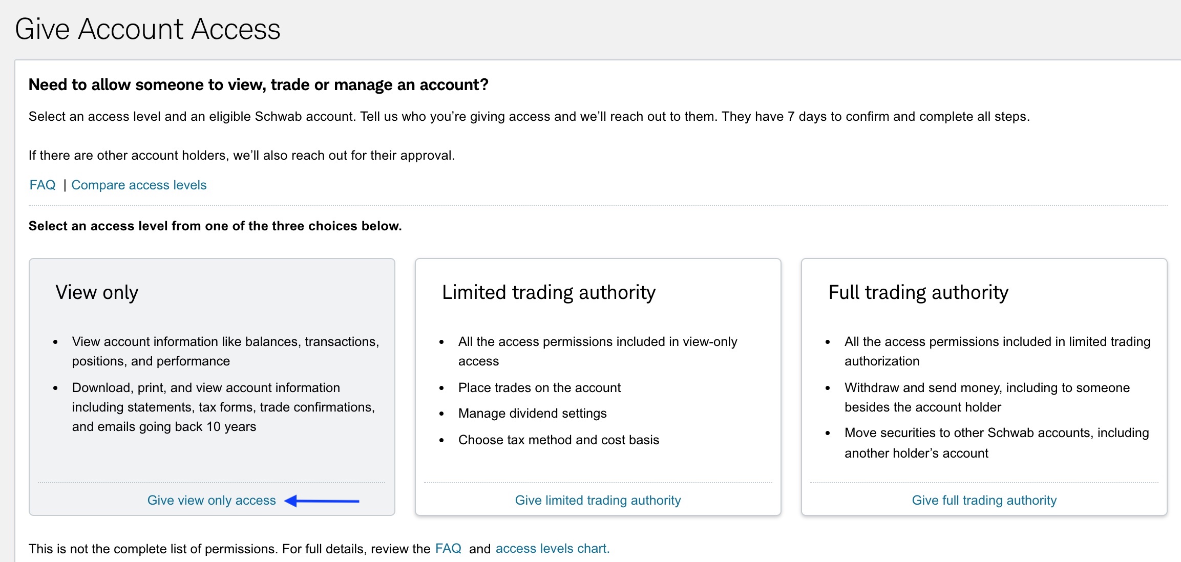 On the page that loads, select “Give view only access” to add an authorized viewer to your Schwab account.